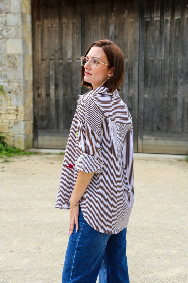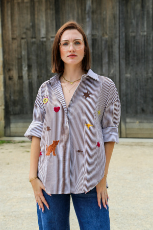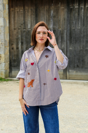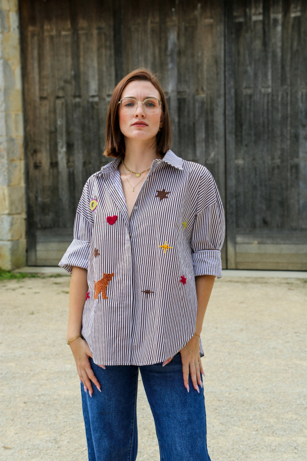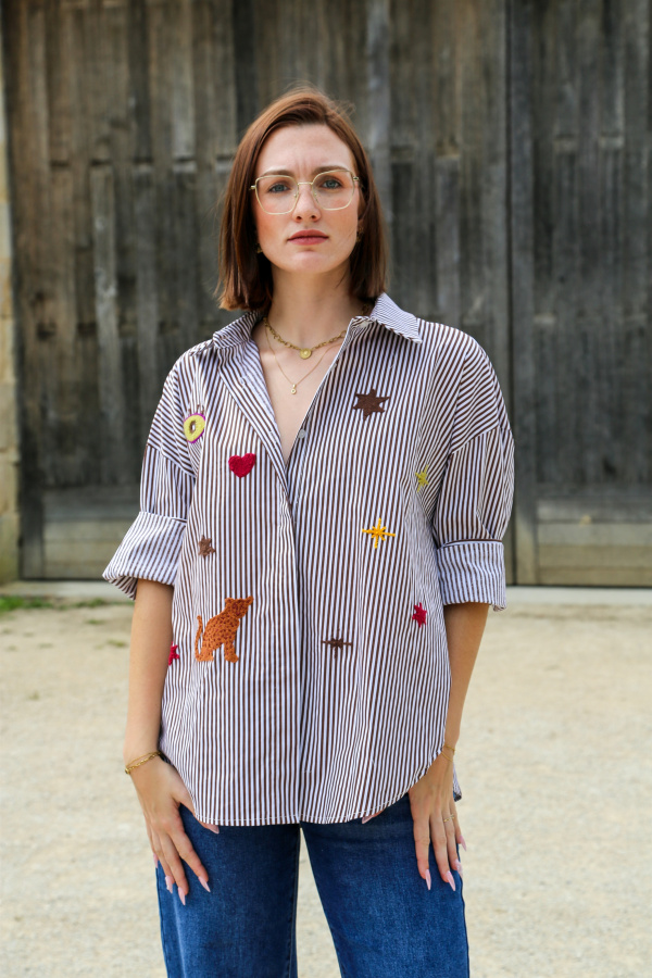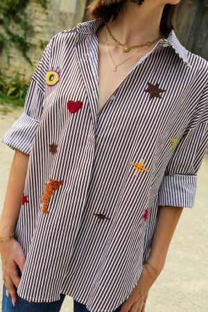 Adoptez un look décontracté et élégant avec cette chemise oversize au style unique. Sa coupe ample vous assure un confort optimal, tout en offrant une silhouette moderne et décontractée. Le tissu à rayures verticales apporte une touche classique et intemporelle, tandis que les broderies multi-motifs sur le devant ajoutent un effet visuel audacieux et artistique.