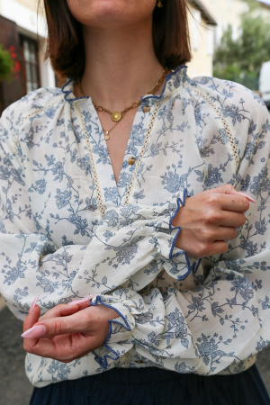 Ce chemisier à manches longues mise sur l'élégance des détails. Son col rond sobre s'associe à des manches légèrement bouffantes, ressérées aux poignets par un élastique discret pour un effet blousant délicat. À l’avant, de subtils détails ajourés longent la patte de boutonnage, apportant une touche de raffinement tout en finesse.