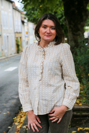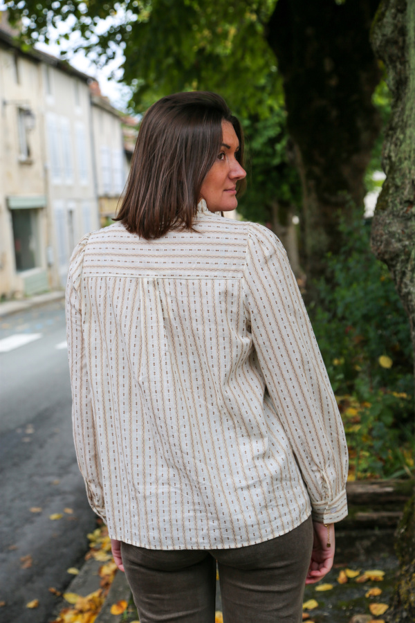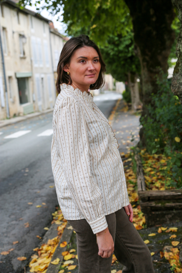 Ce chemisier à manches longues séduit par son allure romantique et ses détails soignés. Son col rond délicatement volanté encadre le visage avec élégance, tandis que son imprimé raffiné apporte une touche de fantaisie et de fraîcheur à votre tenue.