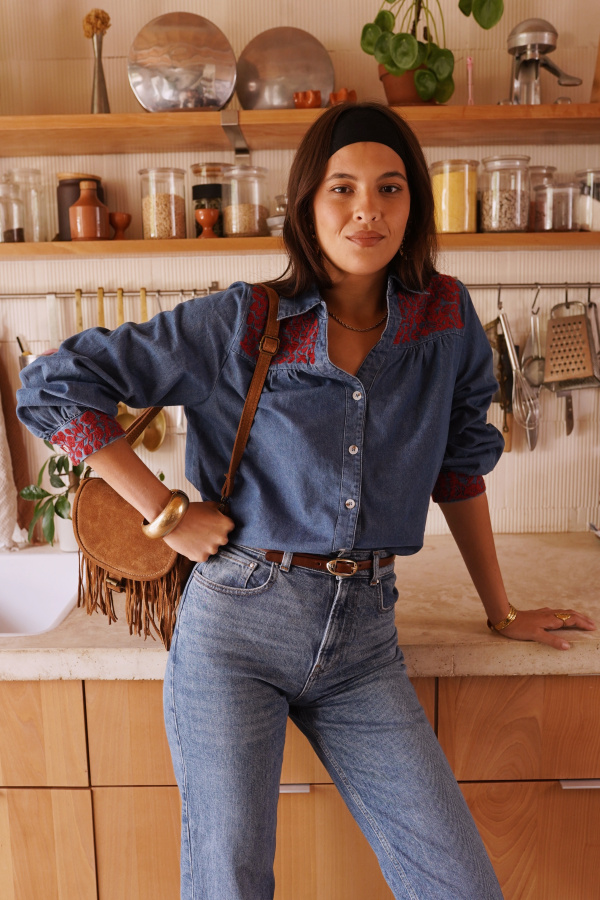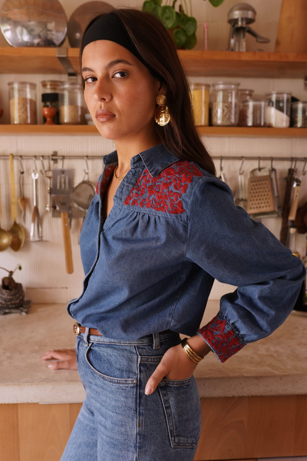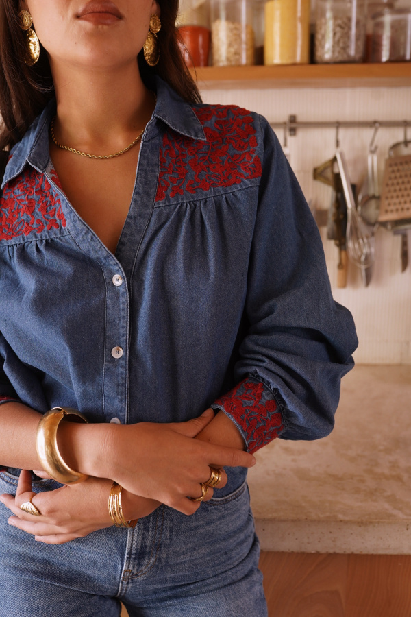 Apportez une touche de poésie à votre look avec cette chemise à manches longues au charme délicat. Son col rond et sa fermeture boutonnée lui confèrent une allure classique, rehaussée par de fines broderies florales qui ajoutent une note féminine et raffinée. Légère et agréable à porter, elle se marie facilement avec un jean ou une jupe pour un style à la fois doux et élégant.