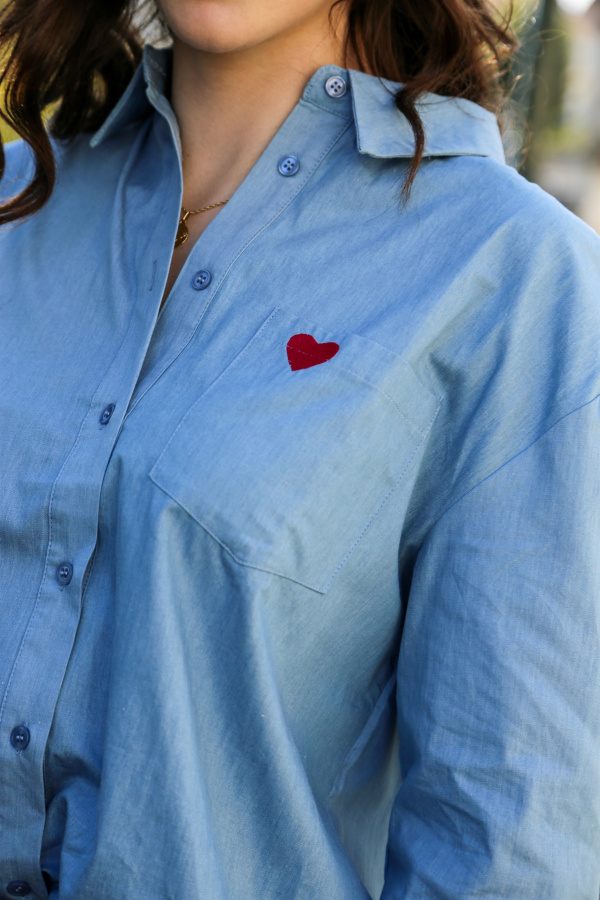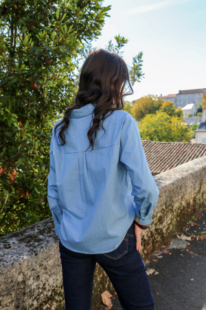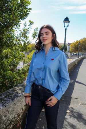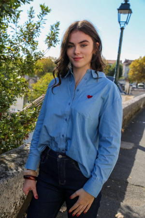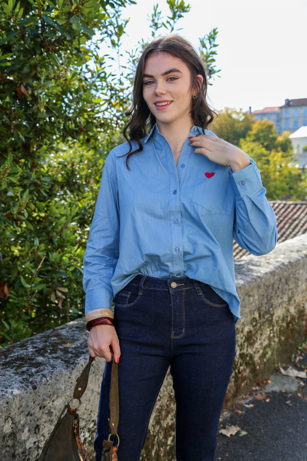 Cette chemise à manches longues incarne la simplicité élégante avec une petite touche de tendresse. Confectionnée dans une matière légère et agréable, elle se distingue par une coupe soignée et des détails délicats. La poche de poitrine est ornée d’un petit cœur brodé, ajoutant une note romantique et féminine à ce modèle classique.