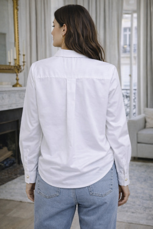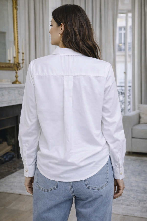 Sa coupe droite apporte une allure moderne et facile à porter, tandis que le col classique et la fermeture boutonnée sur le devant soulignent son style intemporel. Les manches longues légèrement bouffantes, terminées par des poignets boutonnés, ajoutent une touche de féminité et de raffinement. Les boutons effet perle apportent une note délicate et élégante qui fait toute la différence. L’ourlet arrondi permet un porté aussi bien rentré que porté loose.