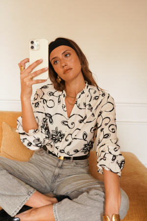 Son encolure légèrement ouverte et son boutonnage discret sur le devant apportent une touche féminine tout en restant facile à porter. L’imprimé noir, travaillé en arabesques florales brodées sur fond écru, crée un contraste chic et structurant.
