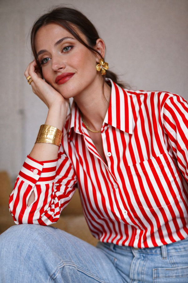 Cette chemise s’adapte aussi bien à un look casual, rentrée dans un jean taille haute, qu’à une tenue plus habillée sous une maille ou un poncho structuré.