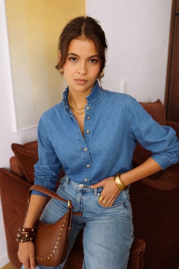 Chemise en denim bleu à l’allure moderne et féminine.