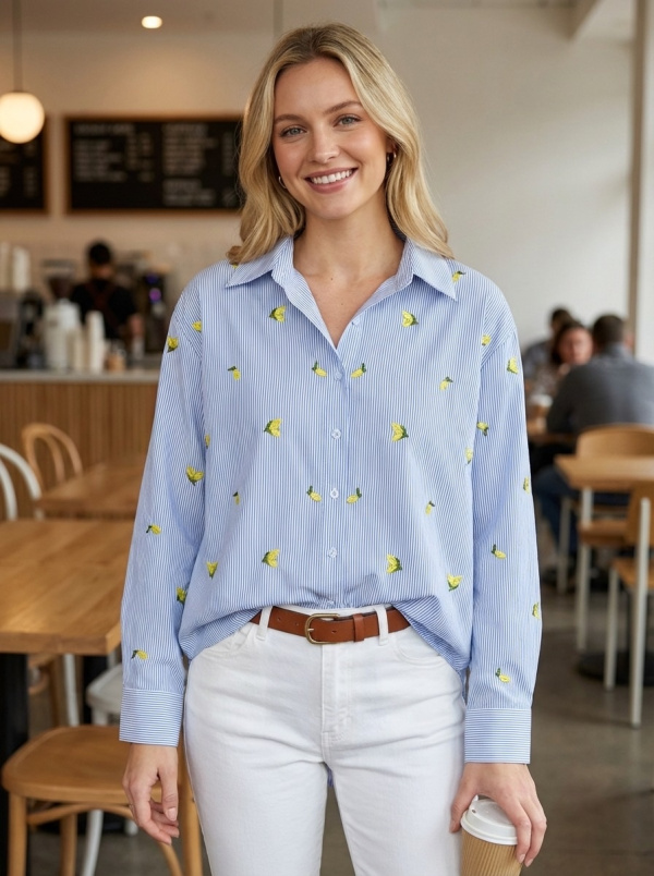 Chemise à manches longues confectionnée dans une popeline légère à fines rayures. Le motif est ponctué de broderies citron jaune, apportant une touche fraîche et graphique. Coupe droite, légèrement ample, pensée pour un porté naturel et confortable.