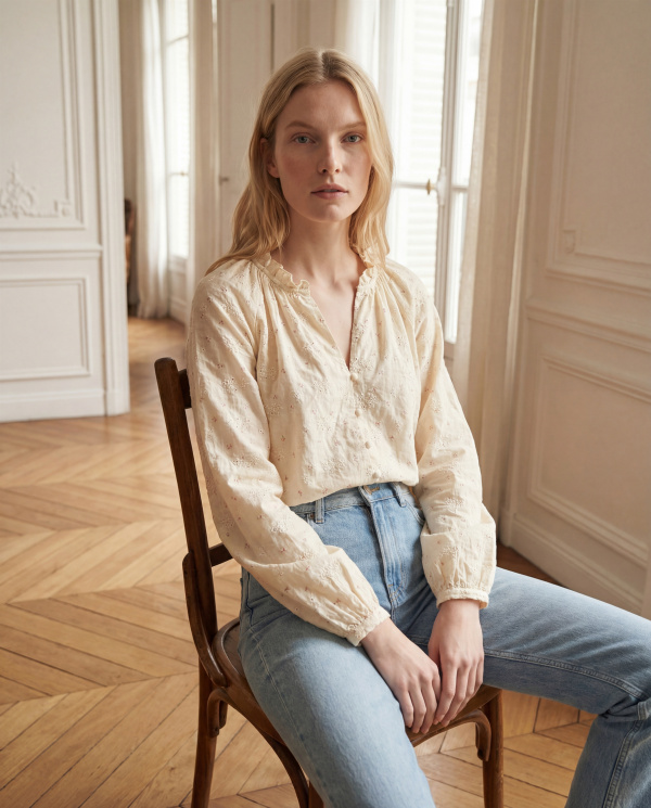 Chemise à l’allure délicate et intemporelle, pensée pour une silhouette naturelle et féminine. Sa coupe droite légèrement ample assure un tombé fluide et confortable, tout en structurant subtilement le buste. L’encolure fendue est soulignée de fronces fines qui apportent du relief et une touche raffinée.
