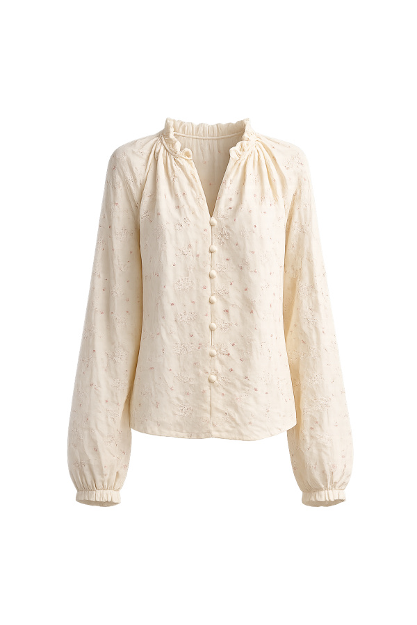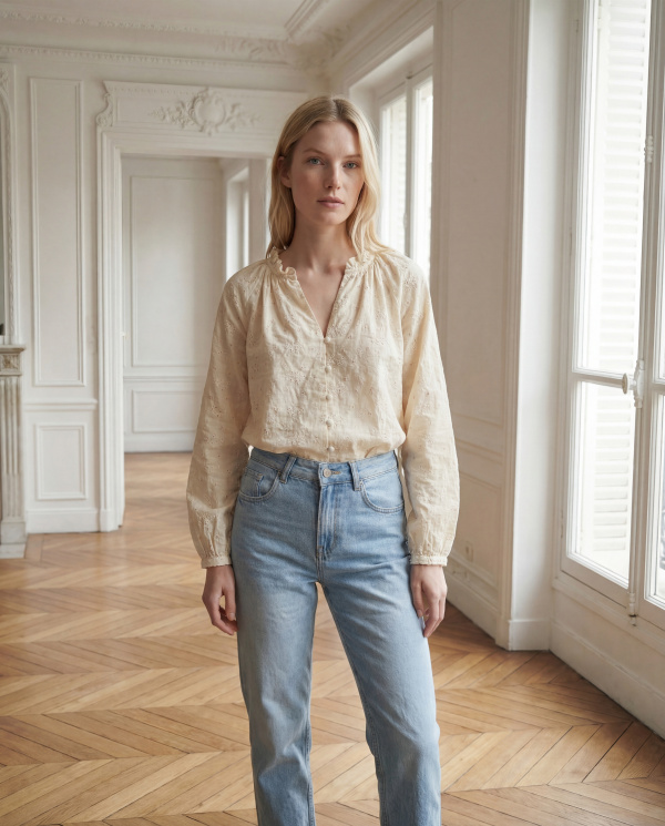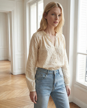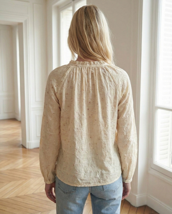 Les manches longues, légèrement bouffantes, se terminent par des poignets resserrés, créant un joli volume et un équilibre élégant. Une chemise facile à porter au quotidien comme dans des silhouettes plus habillées, idéale pour un vestiaire doux et moderne.