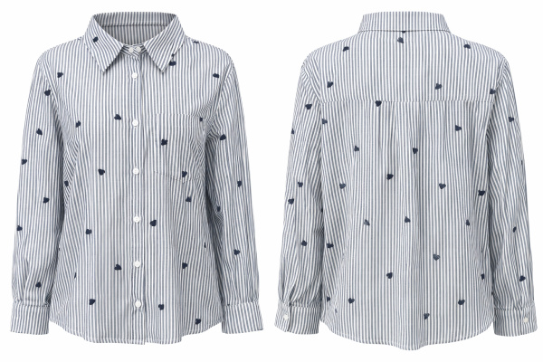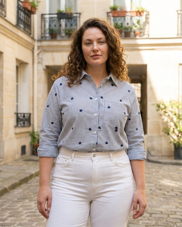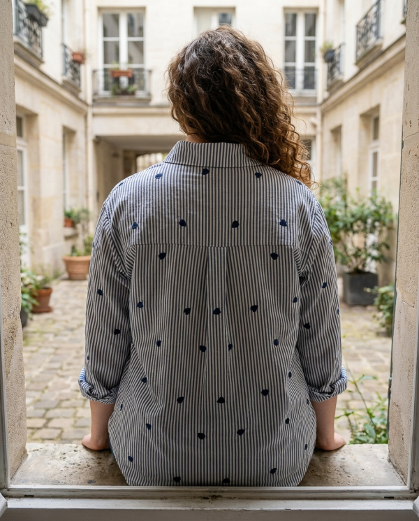 Cette chemise en coton rayé bleu et blanc revisite l’intemporel modèle masculin avec une touche subtile : des mini broderies cœur contrastées, réparties sur l’ensemble du tissu.