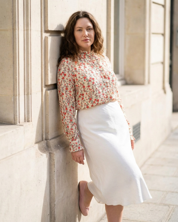 Le col montant structure l’encolure et renforce l’allure sophistiquée du modèle. La coupe droite, légèrement fluide, permet de la porter rentrée dans une jupe taille haute ou laissée libre pour un tombé plus naturel.