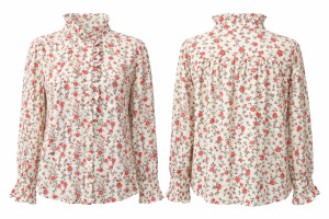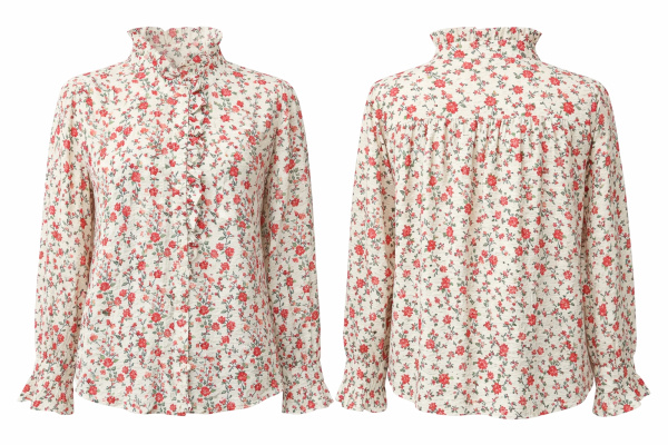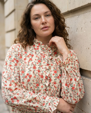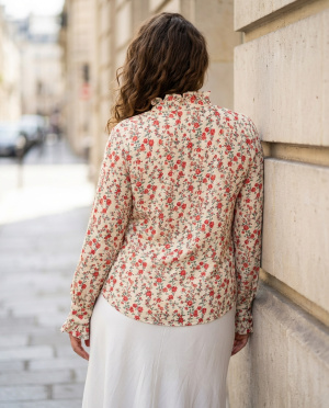 Cette chemise se distingue par son imprimé floral fin, décliné sur une base écrue lumineuse. Les petites fleurs rouges et bleutées apportent du relief visuel sans surcharger la silhouette.