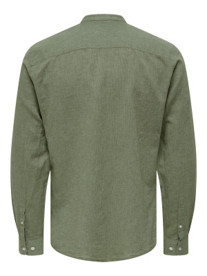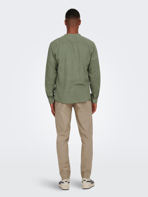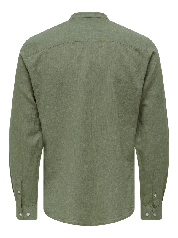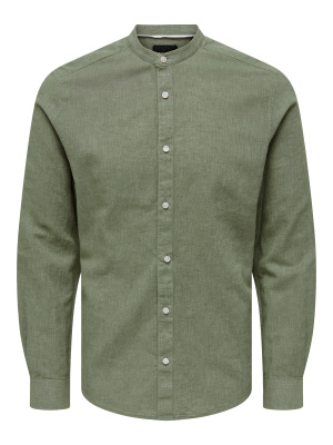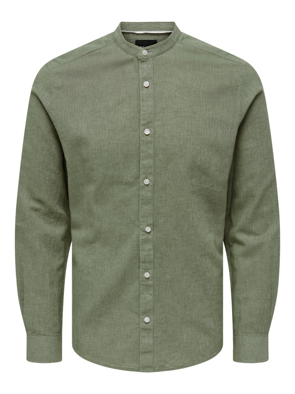 Cette chemise affiche une allure chic-décontractée grâce à son col mao, ses manches longues et sa teinte vert sauge/olive facile à assortir.