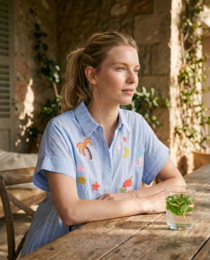 Chemise en 100% coton, légère et respirante, animée par des broderies placées sur l’ensemble du modèle. La coupe fluide et les manches courtes apportent une allure décontractée, tandis que le col classique structure la silhouette. Les motifs brodés, inspirés d’un univers estival et graphique, donnent du relief et une identité forte à la pièce.