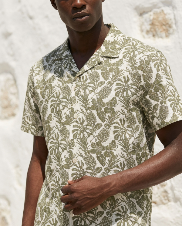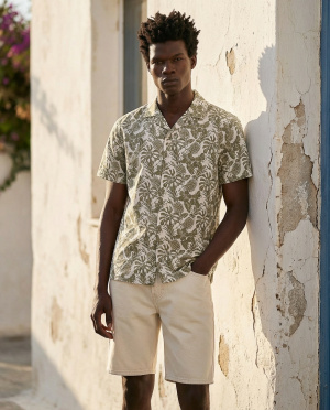 Cette chemisette s’inscrit dans un registre estival maîtrisé, mêlant fraîcheur visuelle et élégance décontractée. Son imprimé végétal, travaillé dans des nuances de kaki et beige, apporte du relief tout en conservant une lecture subtile et haut de gamme.