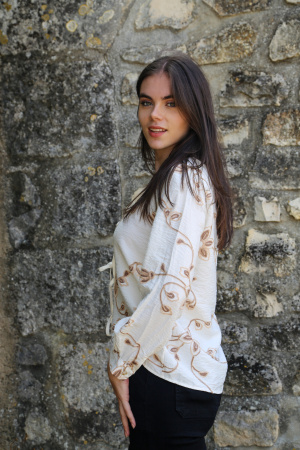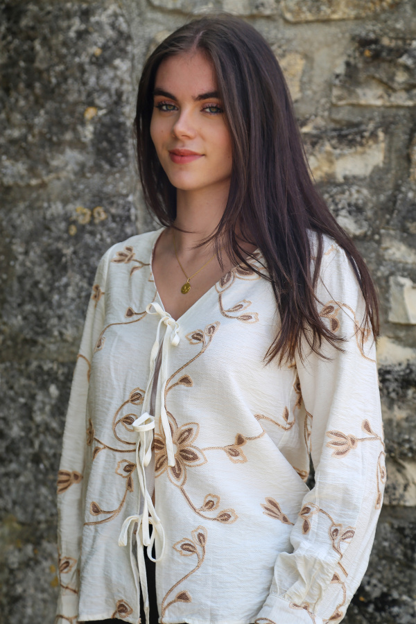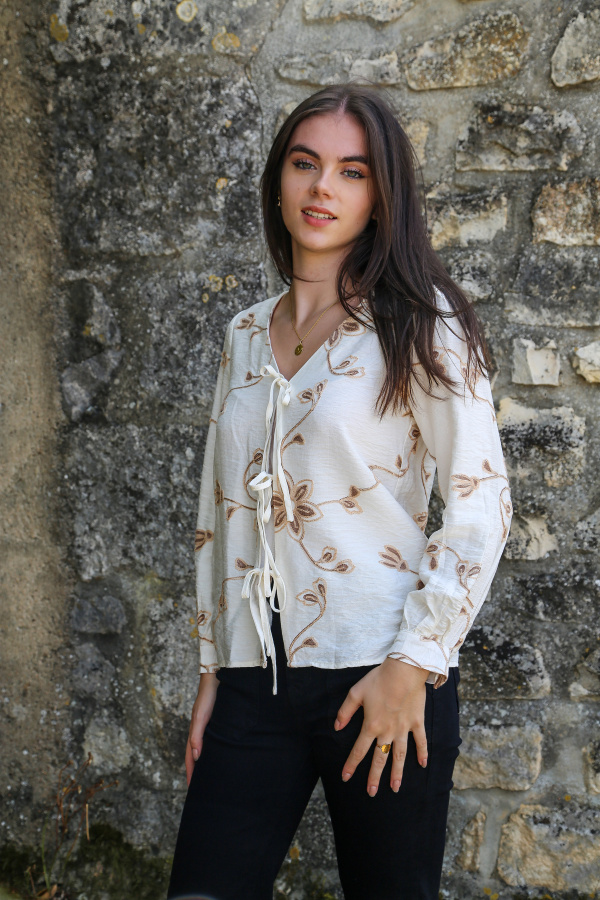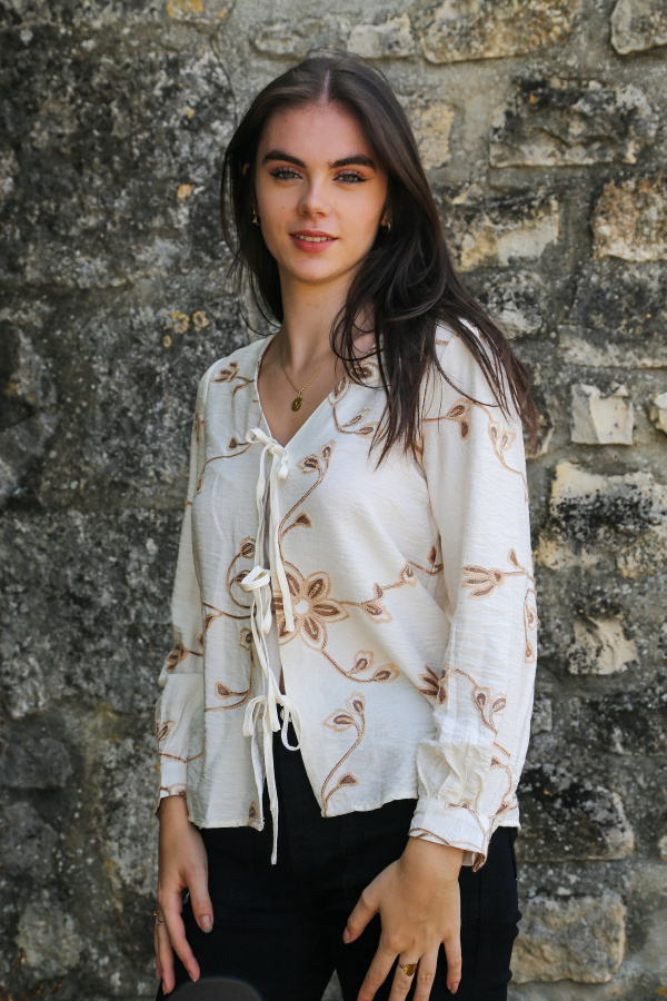 Féminin et délicat, ce top à manches longues séduit par ses détails raffinés. Son col V met en valeur le décolleté avec élégance, tandis que la fermeture à l’avant par trois nœuds apporte une touche originale et pleine de charme. Les motifs brodés ajoutent une dimension artisanale et authentique, pour un look à la fois doux et sophistiqué. Idéal à porter avec un jean taille haute ou une jupe fluide pour un style bohème chic.