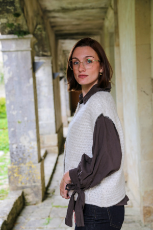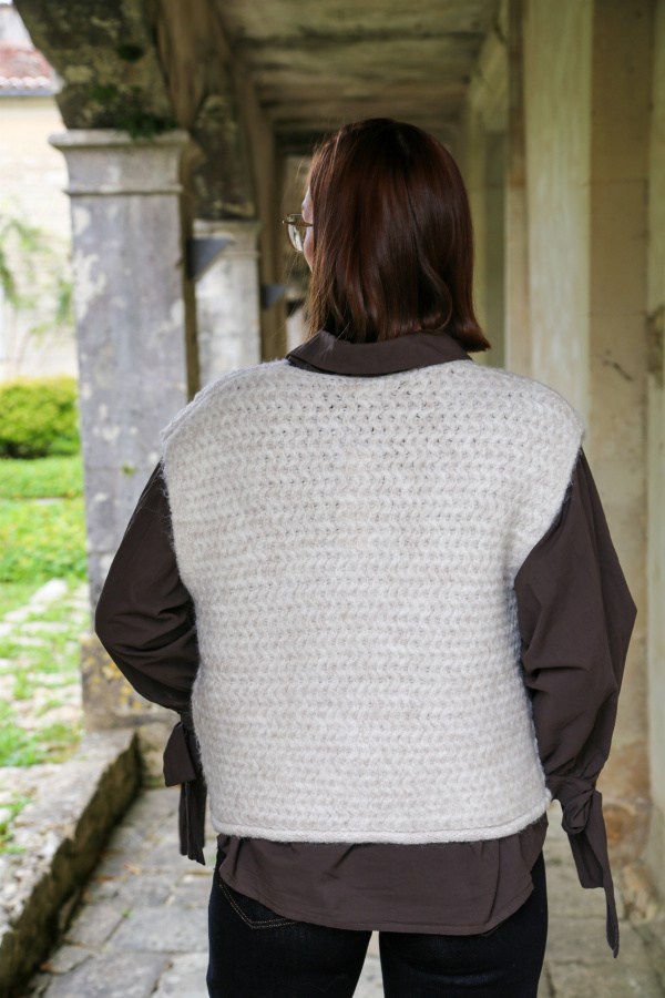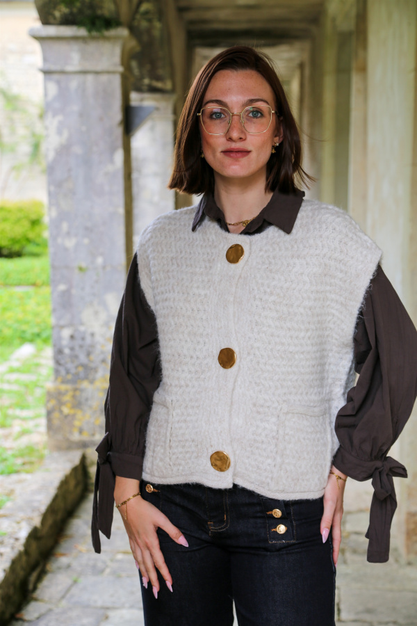 Ajoutez une touche de charme vintage à votre tenue avec ce gilet court sans manches en grosse maille. Doté d’un col rond et d’une fermeture par de superbes boutons dorés martelés, il allie caractère et féminité. Sa coupe courte met en valeur la silhouette, tandis que la maille texturée apporte un côté cosy et tendance.