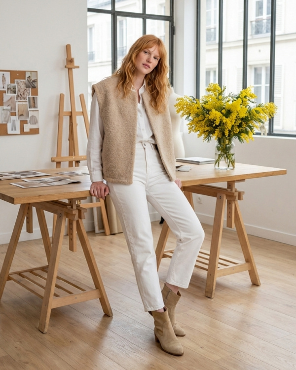 Ce gilet sans manches au délicat aspect feutrine apporte une touche moderne et épurée à votre tenue. Conçu sans fermeture, il se porte ouvert pour une allure fluide et décontractée. Sa matière douce et structurée offre un joli tombé, idéal pour superposer sur un pull fin, une chemise ou une robe. Une pièce légère et polyvalente, parfaite pour ajouter une note de style en toute simplicité.