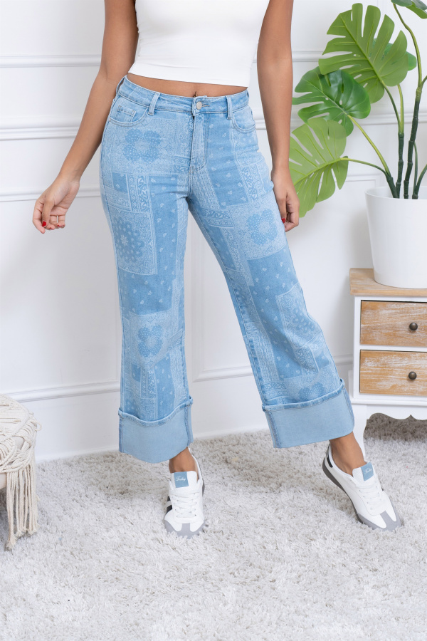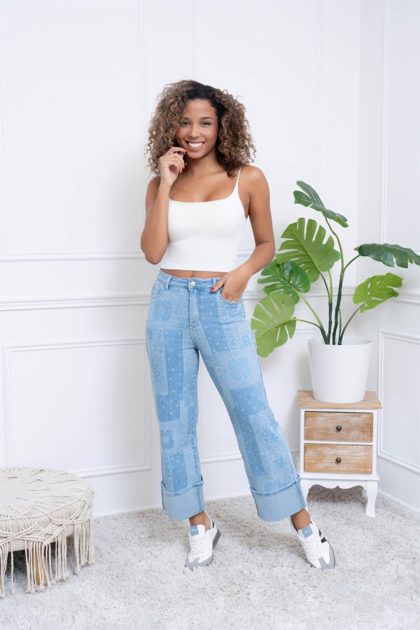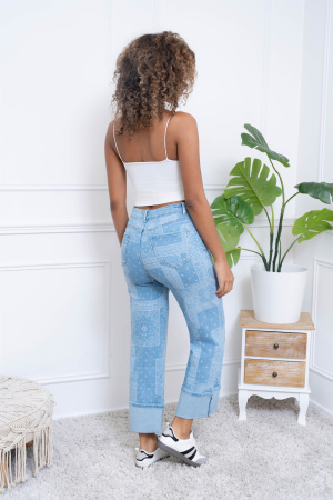 Un mélange parfait entre confort, style et tendance, ce jean à motif bandana avec grand revers est l'allié parfait pour ajouter de la personnalité à votre garde-robe.