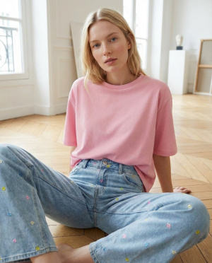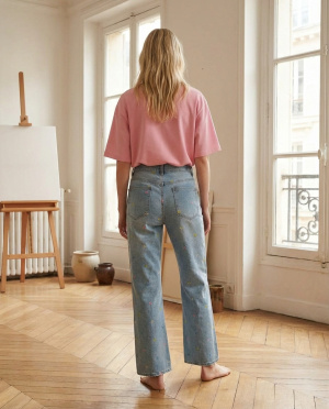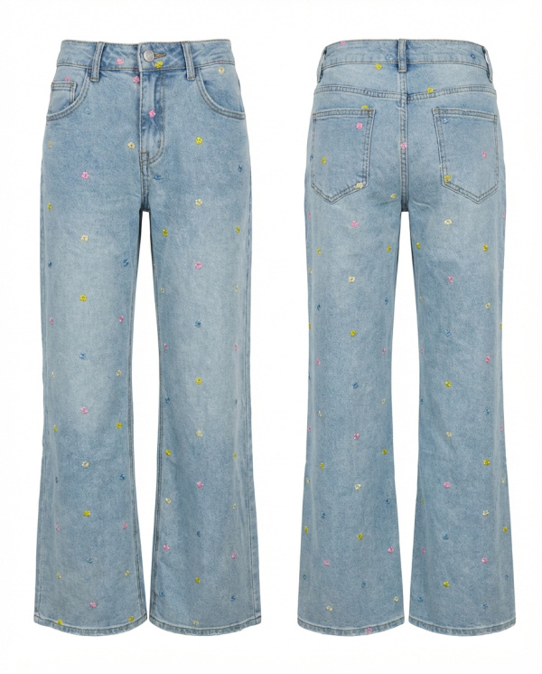Jean taille haute à la coupe flare, ajustée sur les hanches puis évasée à partir du genou pour une silhouette élancée et équilibrée. Confectionné dans un denim bleu clair à l’aspect légèrement délavé, il est orné de broderies fleurs multicolores délicates, réparties sur l’ensemble des jambes.