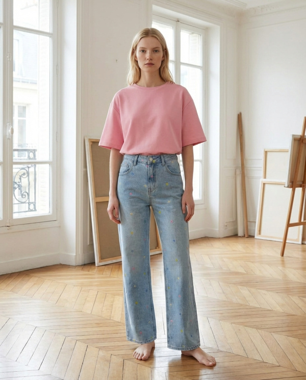 Les broderies apportent une touche graphique et féminine tout en restant subtilement intégrées au denim. La taille structurée assure un bon maintien, tandis que la coupe flare modernise l’allure avec une élégance naturelle.