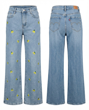 Ce jean brodé citron apporte une touche de fraîcheur et de bonne humeur à un indispensable du vestiaire féminin. Confectionné en denim de coton, il se distingue par ses broderies citron délicates et lumineuses, qui donnent du caractère à la silhouette tout en restant faciles à porter au quotidien.