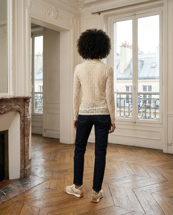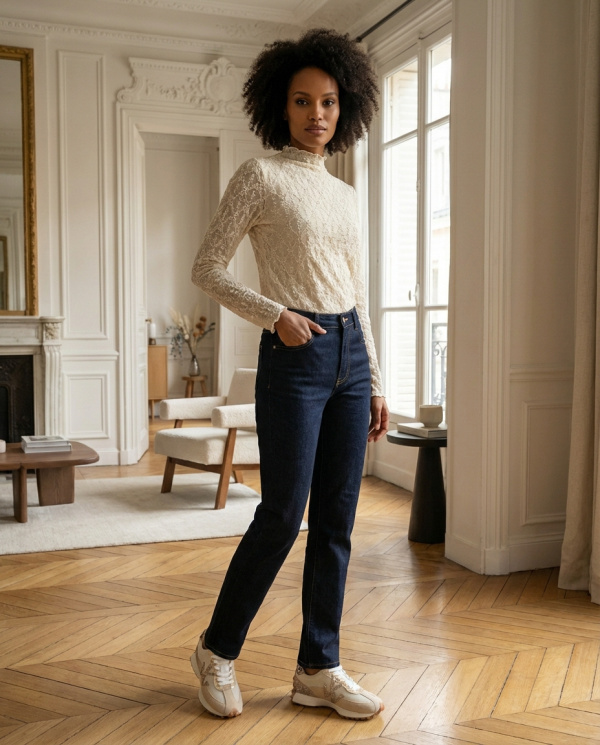 Jean à l’allure féminine et structurée, conçu pour sublimer la silhouette. Sa coupe ajustée épouse les lignes avec précision, tandis que la construction push-up galbe et met en valeur les formes de manière naturelle. La taille bien placée assure un maintien confortable et un porté flatteur au quotidien.