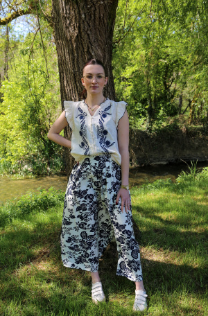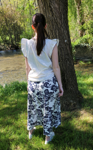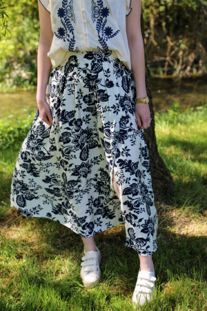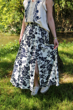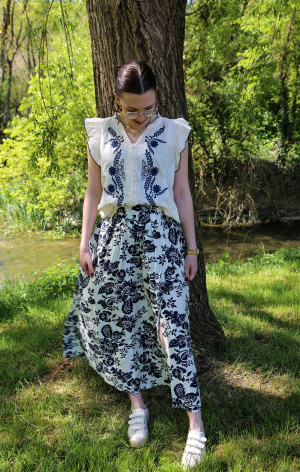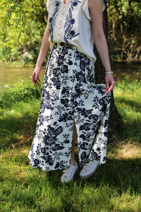 Idéale pour un look estival chic, cette jupe se porte aussi bien avec un top simple qu’une blouse légère pour un ensemble harmonieux et élégant.