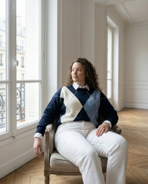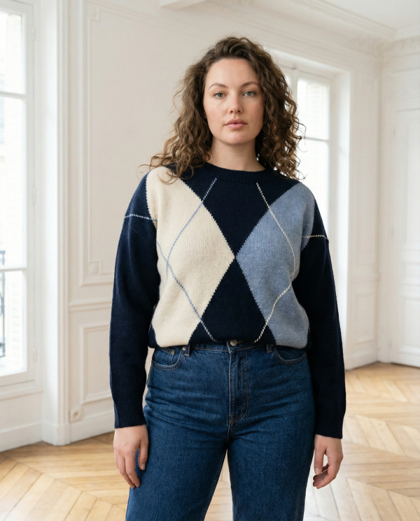 Le col rond apporte une ligne nette et classique, tandis que les manches longues offrent une allure enveloppante et cosy. La maille présente un motif géométrique structuré, travaillé en contraste, qui donne du relief et une vraie identité à la pièce sans en faire trop.