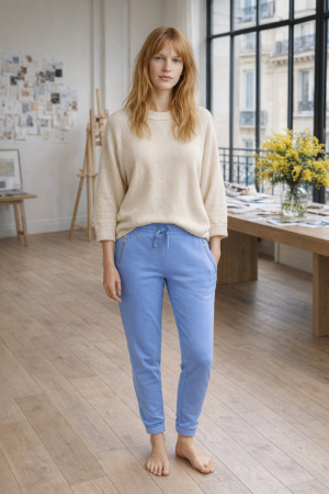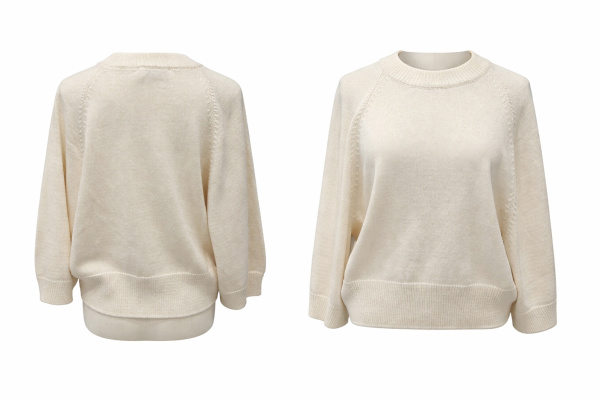 Le col rond est travaillé avec une bordure en côte qui structure l’encolure. Les manches 3/4 sont montées en raglan et soulignées par des coutures apparentes décoratives qui dessinent une ligne nette depuis le col jusqu’aux côtés, à l’avant comme au dos. Ce détail apporte du relief et une signature plus mode, tout en restant minimal.