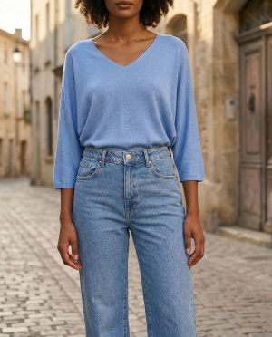 Ce pull fin séduit par sa simplicité élégante et sa maille légère, idéale pour la mi-saison ou les superpositions. Sa coupe droite légèrement ample offre un tombé naturel et confortable, tandis que son col V délicat met subtilement en valeur le décolleté.
