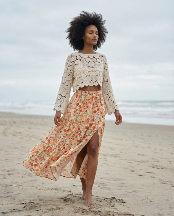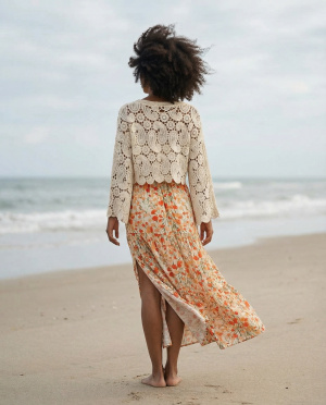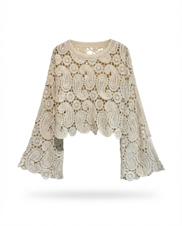 Le travail de crochet ajouré dévoile un motif riche et texturé, inspiré de formes organiques et graphiques, apportant relief et profondeur. Les manches longues évasées renforcent l’allure bohème et structurent la silhouette avec mouvement. L’encolure arrondie équilibre l’ensemble pour un rendu harmonieux.
