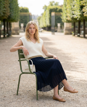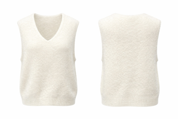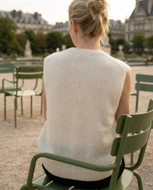 Pull sans manches en maille légère à la texture subtilement duveteuse. Sa coupe droite légèrement ample structure la silhouette tout en conservant une allure naturelle et contemporaine.
