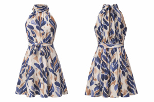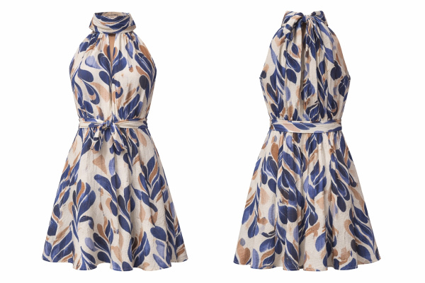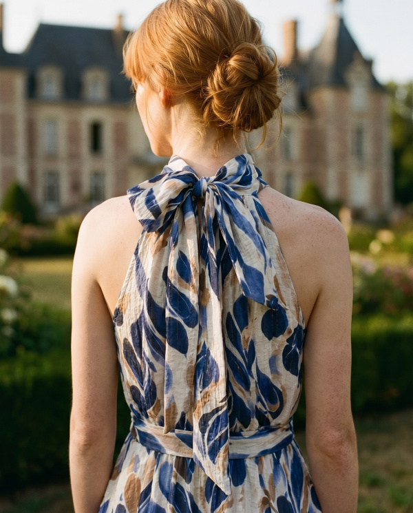 Sans manches, elle se distingue par une encolure montante nouée qui encadre le port de tête avec élégance et crée un détail signature. La taille est délicatement marquée par un lien à nouer, permettant d’ajuster le volume et de structurer la silhouette.