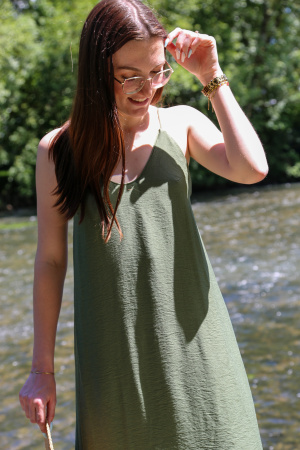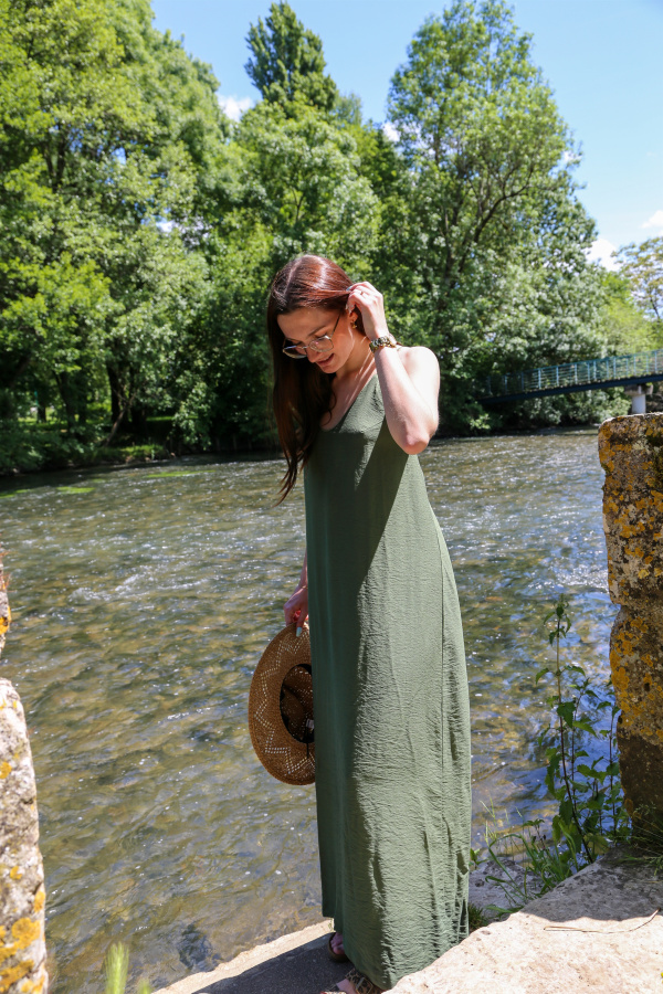 Cette robe longue fluide incarne l'élégance ultime avec son dos nu plongeant croisé, délicatement orné de perles décoratives pour une touche de sophistication. Son col V met en valeur le décolleté avec finesse, tandis que les fentes à l'arrière ajoutent une dimension sensuelle et moderne à la silhouette.