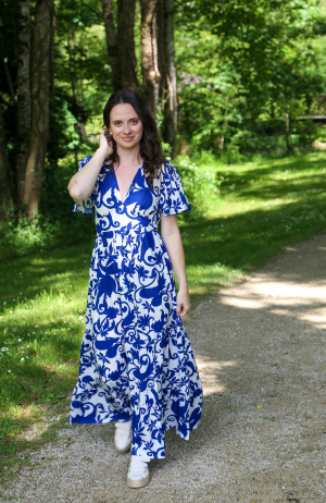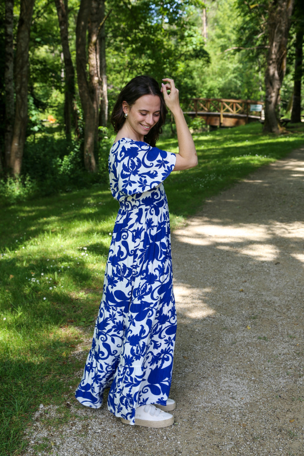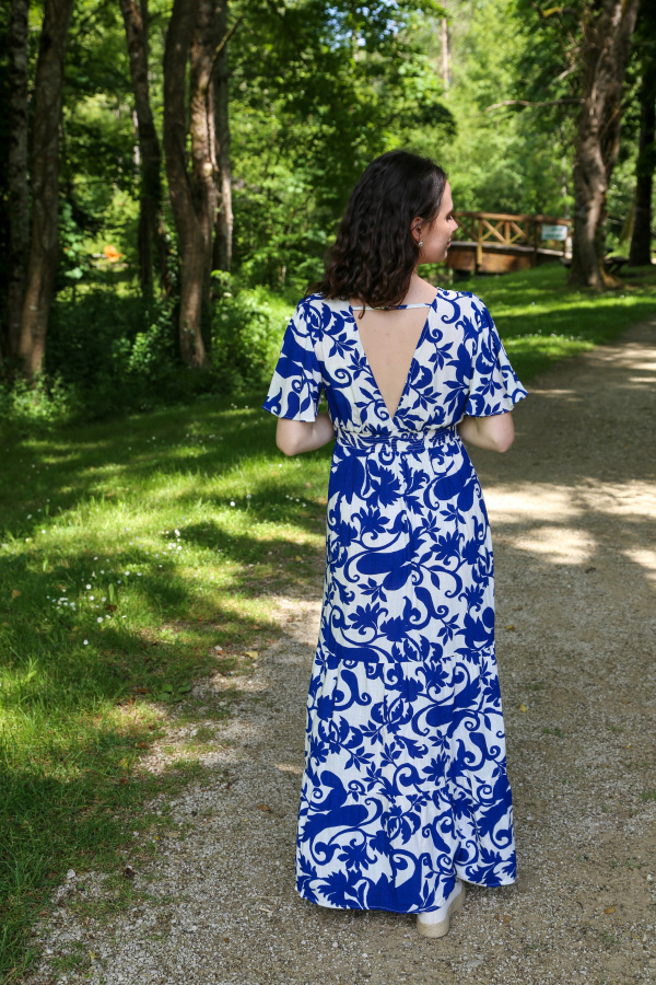 Sublimez votre silhouette avec cette robe longue à manches courtes évasées, alliant élégance et légèreté. Son col V délicat met en valeur le décolleté avec subtilité, tandis que la coupe resserrée à la taille souligne joliment vos courbes.