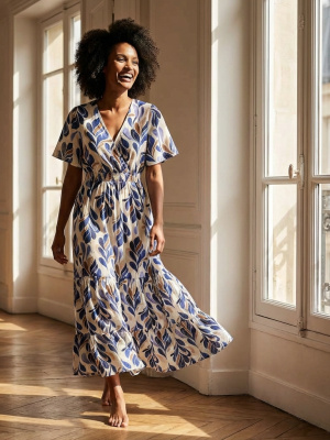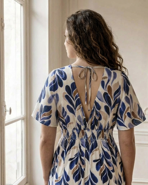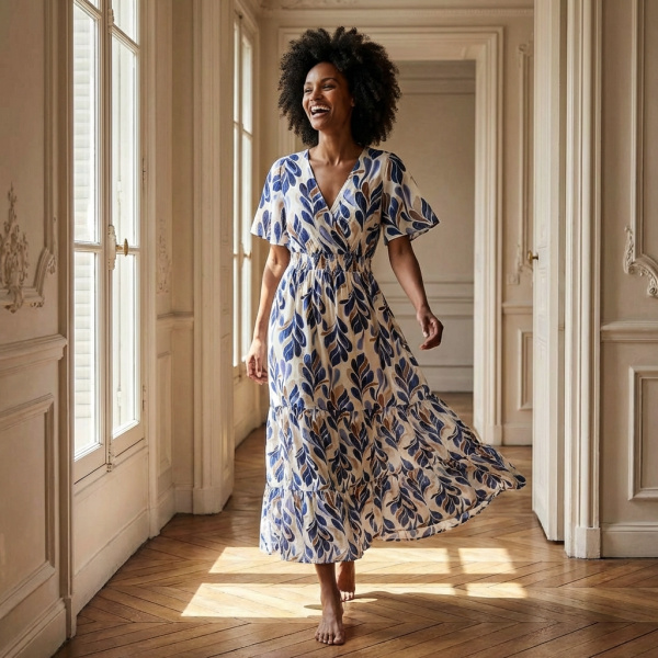 Le col en V met en valeur le décolleté avec subtilité, tandis que la taille marquée structure la silhouette et crée un joli jeu de volume sur la jupe. Les manches courtes offrent un porté confortable et équilibré. La jupe longue et fluide accompagne les mouvements pour une allure aérienne et élégante.