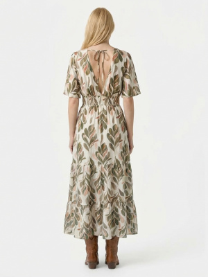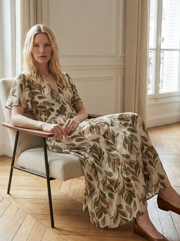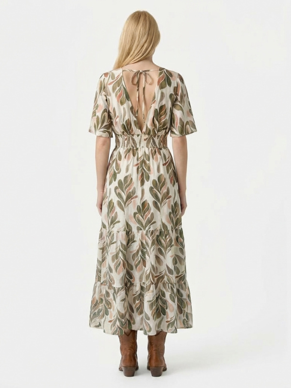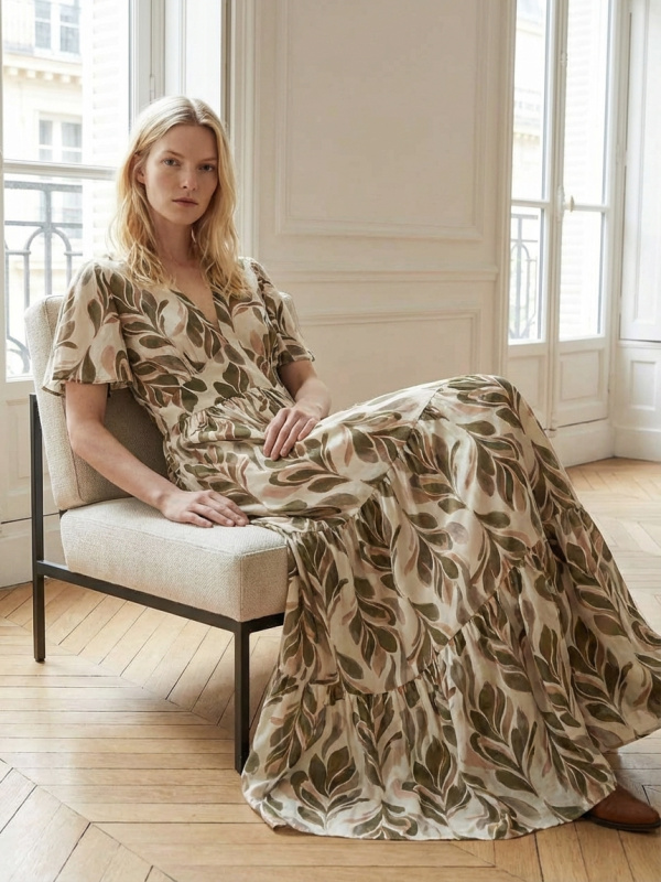 Le col en V met en valeur le décolleté avec subtilité, tandis que la taille marquée structure la silhouette et crée un joli jeu de volume sur la jupe. Les manches courtes offrent un porté confortable et équilibré. La jupe longue et fluide accompagne les mouvements pour une allure aérienne et élégante.