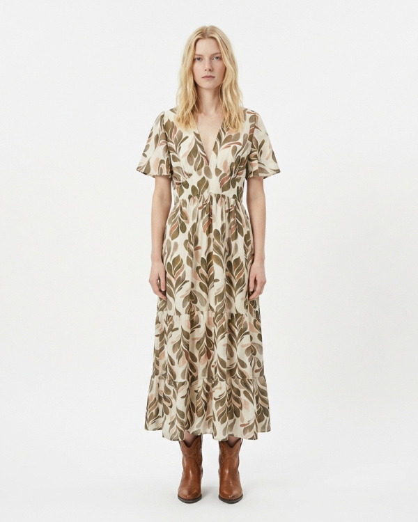 Robe longue à l’allure fluide et féminine, conçue dans un tissu léger et agréable à porter. Son imprimé graphique végétal apporte du caractère tout en conservant une élégance naturelle, idéale pour un vestiaire estival ou de mi-saison.