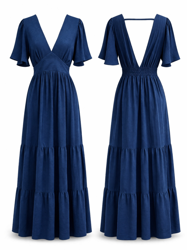 Le décolleté en V et les manches courtes aériennes apportent de la légèreté, tandis que la jupe à étages crée un mouvement naturel et féminin. Une pièce facile à porter, pensée pour allier confort et élégance au quotidien.