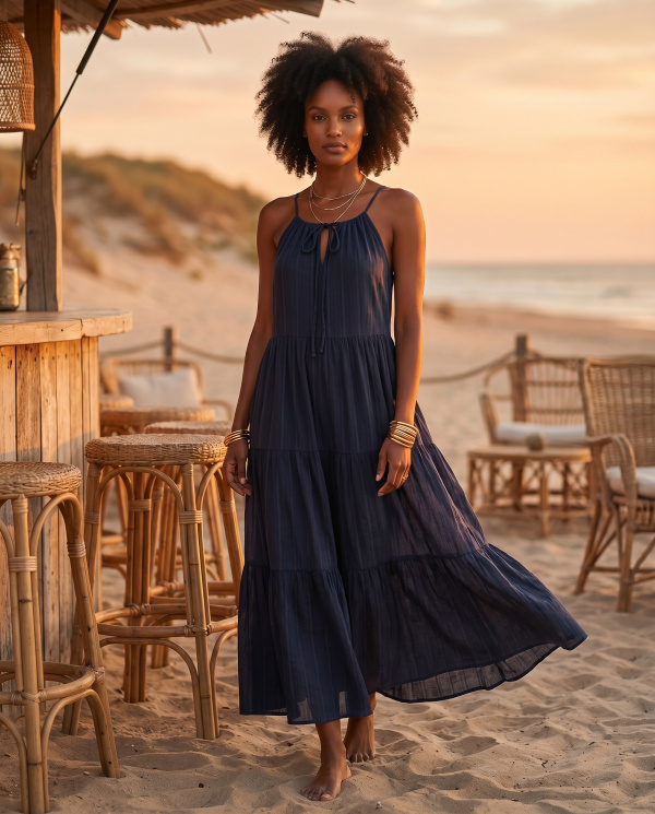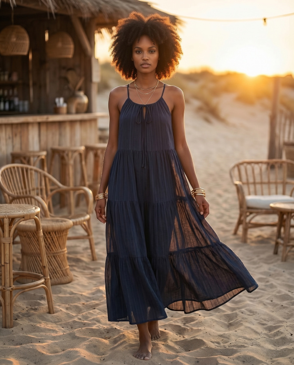Robe longue en coton majoritaire, légère et respirante, conçue pour une silhouette fluide et naturelle. Le décolleté délicat et les fines bretelles dégagent le haut du corps, tandis que la coupe évasée et les découpes apportent du mouvement. Le tissu, souple et légèrement texturé, accompagne chaque geste avec élégance.