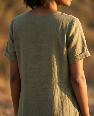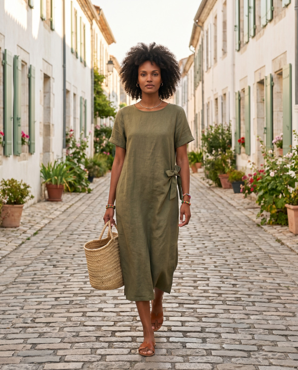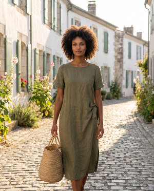 Robe en 100% lin, à la coupe épurée et naturelle. Sa ligne droite est structurée par une taille ajustable sur le côté, apportant une touche féminine tout en conservant une allure minimaliste. Le lin, légèrement texturé, offre un tombé souple et respirant, idéal pour les journées estivales.