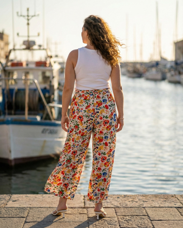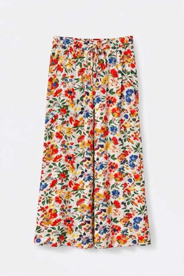 Son imprimé floral multicolore sur fond écru apporte une touche vibrante et lumineuse, idéale pour la saison. La taille élastiquée avec lien de serrage permet un ajustement parfait tout en soulignant délicatement la taille.