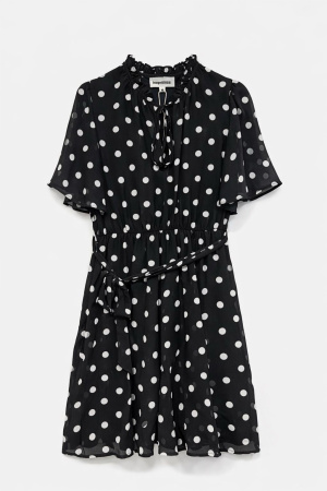 Le col froncé avec lien apporte une finition délicate et modulable, tandis que les manches courtes fluides renforcent l’allure légère et aérienne. L’imprimé pois blanc sur fond noir, intemporel et graphique, donne du caractère à la pièce tout en restant facile à porter.
