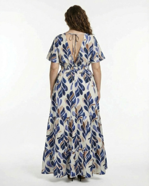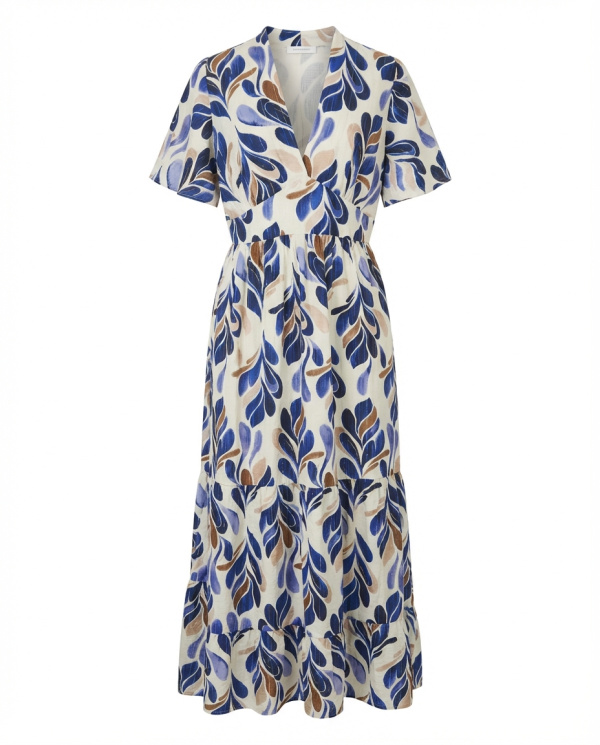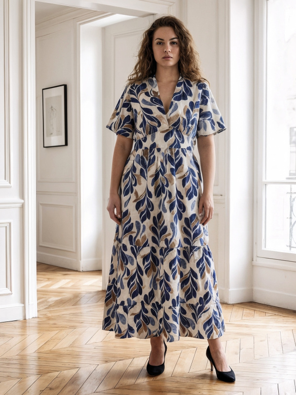 Féminine et fluide, cette robe longue séduit par son imprimé végétal graphique aux tons bleus et naturels. Sa coupe empire souligne la poitrine tout en offrant un tombé ample et confortable, idéal pour mettre en valeur la silhouette avec élégance.
