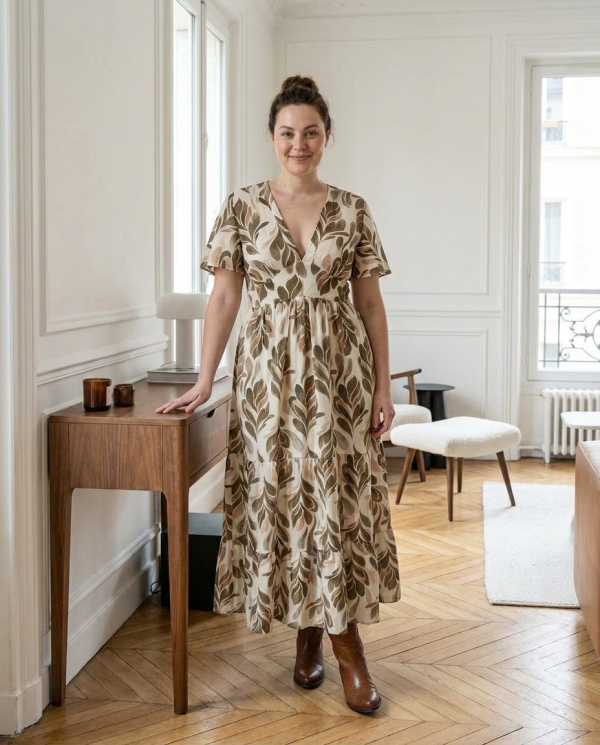 Le décolleté en V apporte une touche raffinée, tandis que les manches courtes légèrement volantées équilibrent la ligne avec douceur. La jupe longue, ponctuée de volants discrets, accompagne le mouvement et renforce l’allure bohème chic de la pièce. Une robe facile à porter, pensée pour conjuguer style et confort au quotidien comme pour des occasions plus habillées.