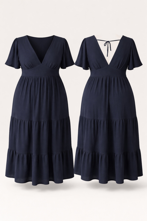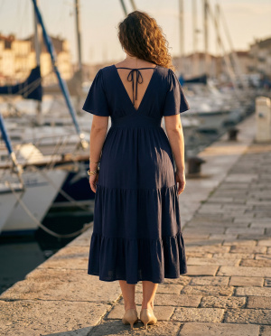 Le décolleté en V met en valeur le port de tête, tandis que les manches courtes évasées apportent du mouvement et une touche féminine. Le dos est délicatement souligné par un lien à nouer, ajoutant un détail subtil et ajustable. La jupe à volants crée un tombé aérien, renforçant l’allure fluide et estivale.