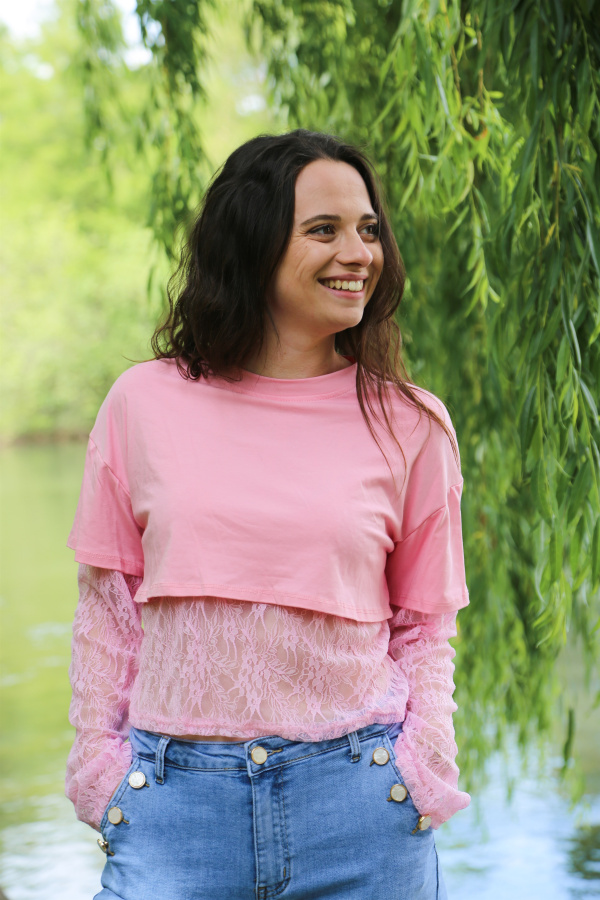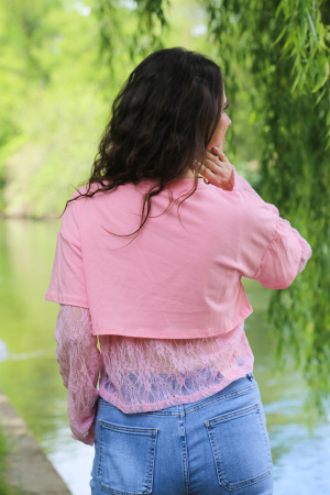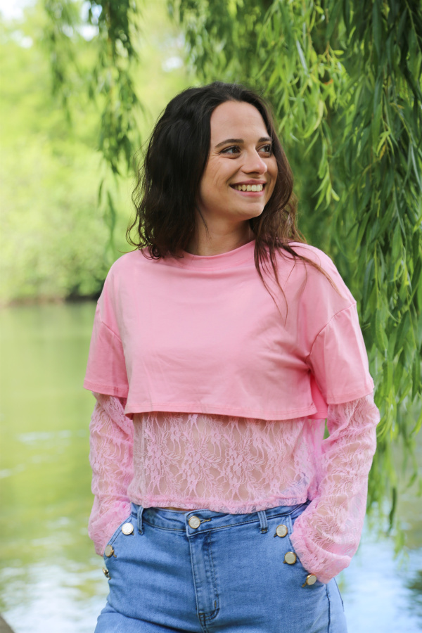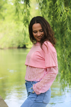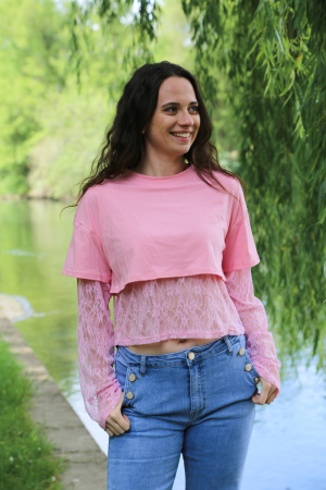 Alliant modernité et élégance, ce T-shirt court à col rond se distingue par ses manches longues en dentelle délicate. Un mélange parfait de confort et de féminité, il apporte une touche chic et raffinée à vos tenues casual tout en mettant en valeur votre silhouette.