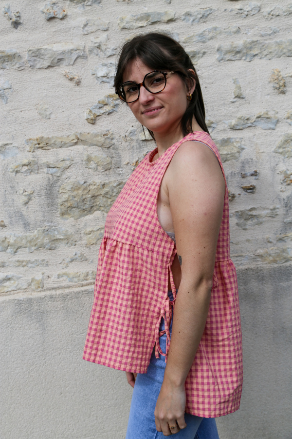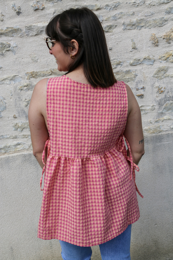 Frais, léger et plein de charme, ce top sans manches à motif vichy est une vraie ode à l’été. Son col rond classique équilibre à merveille le détail original des côtés ouverts, fermés par de jolis nœuds qui ajoutent une touche féminine et moderne.