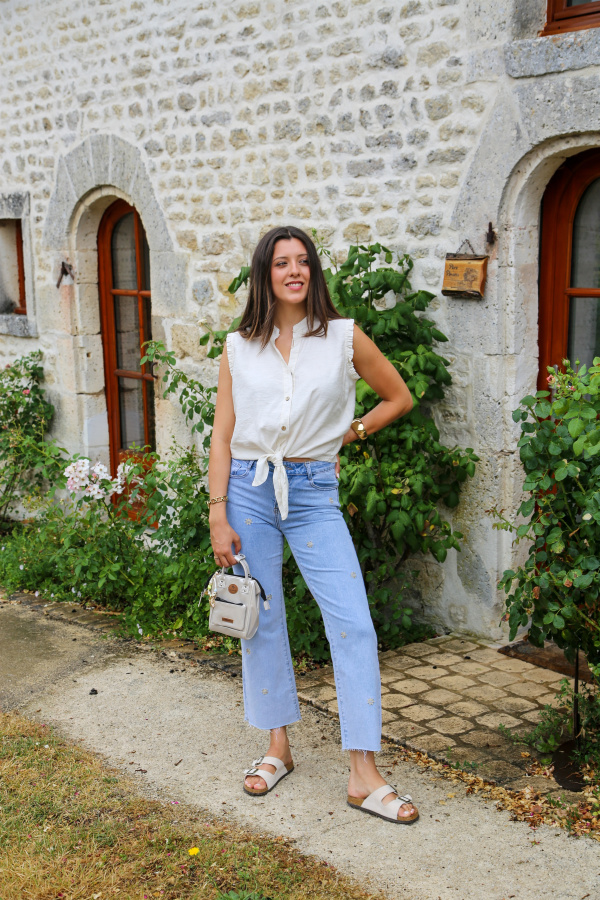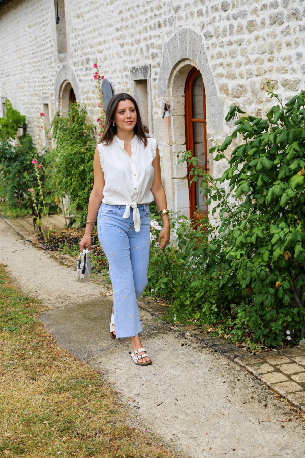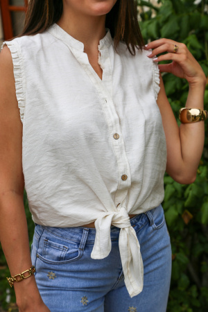 Léger et féminin, ce top sans manches est la pièce parfaite pour un look estival tout en simplicité. Son col rond intemporel met en valeur le port de tête, tandis que la fermeture à boutons sur le devant apporte une touche délicate. Le nœud à nouer sur le bas ajoute une note tendance et décontractée, idéale pour un style frais et moderne.
