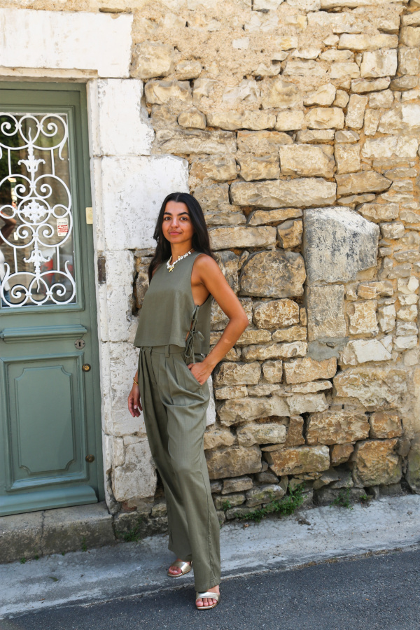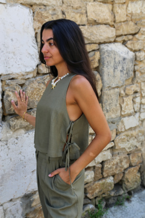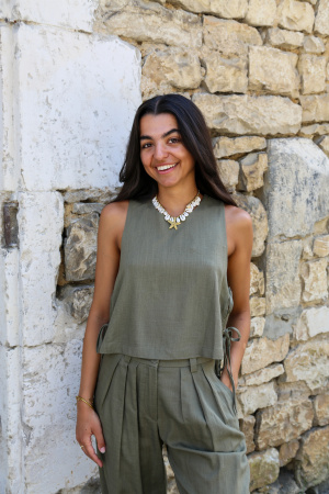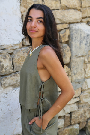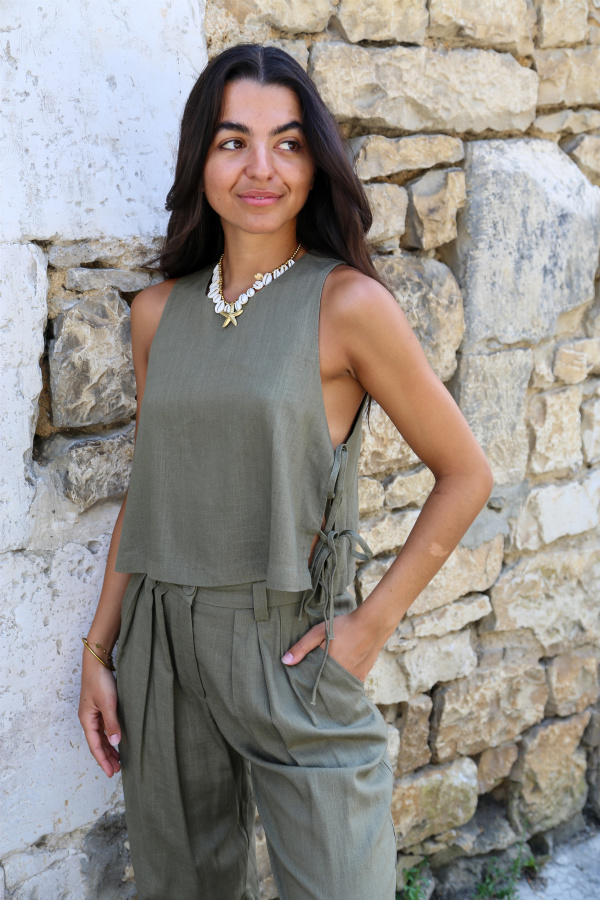 Ce top sans manches allie minimalisme et originalité avec ses côtés ouverts, subtilement noués pour un effet léger et aérien. Son col rond classique apporte une touche de douceur, tandis que la coupe droite assure un tombé fluide et flatteur. Parfait pour les journées ensoleillées ou pour superposer avec style, ce modèle revisite le basique avec une touche moderne et féminine.